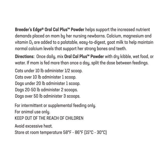 Breeder’s Edge® Oral Cal Plus™ Powder is a calcium supplement for nursing dogs and cats. Oral Cal Plus powder supports the increased nutrient demands placed on mom by her nursing newborns. During nursing, her need for calcium is at its highest since producing milk for newborns may cause calcium to be drawn from her bones and teeth.