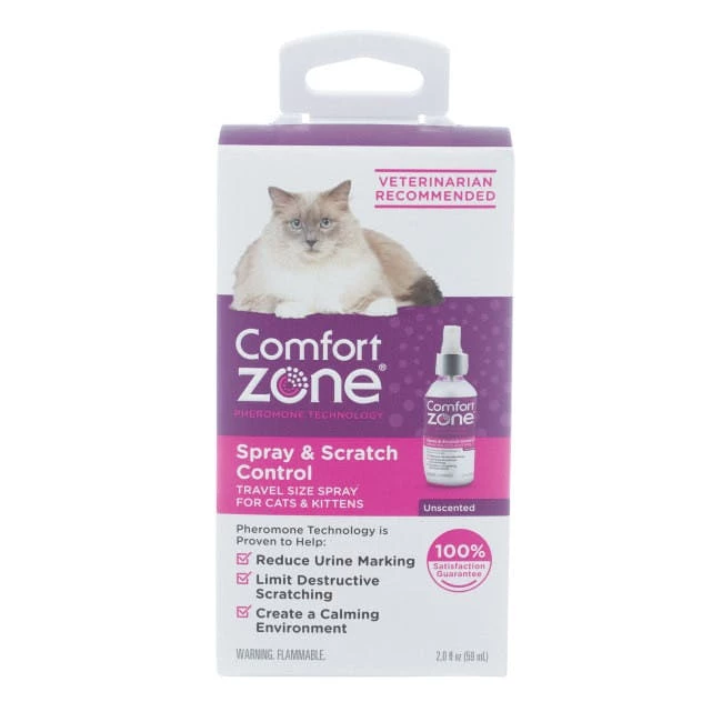 - Use Comfort Zone® Spray and Scratch Control to stop and prevent cat urine marking and scratching