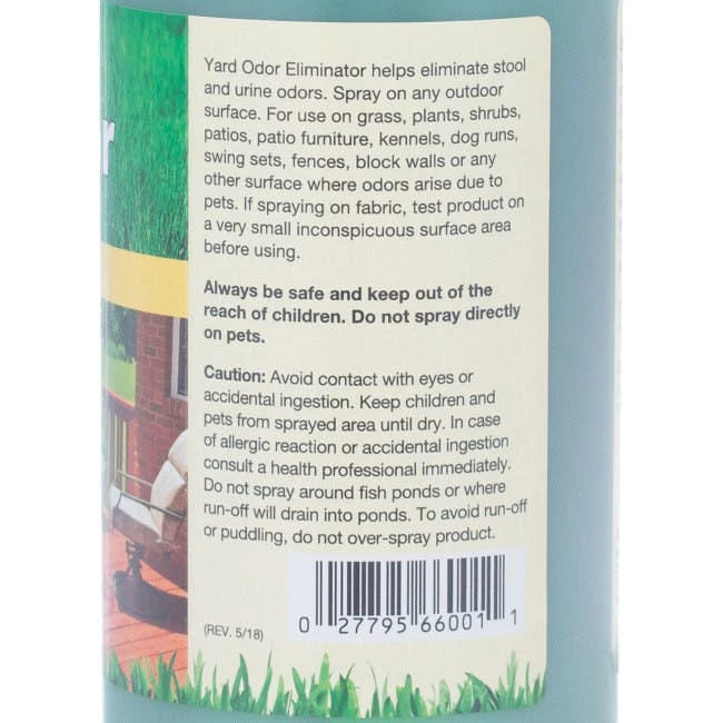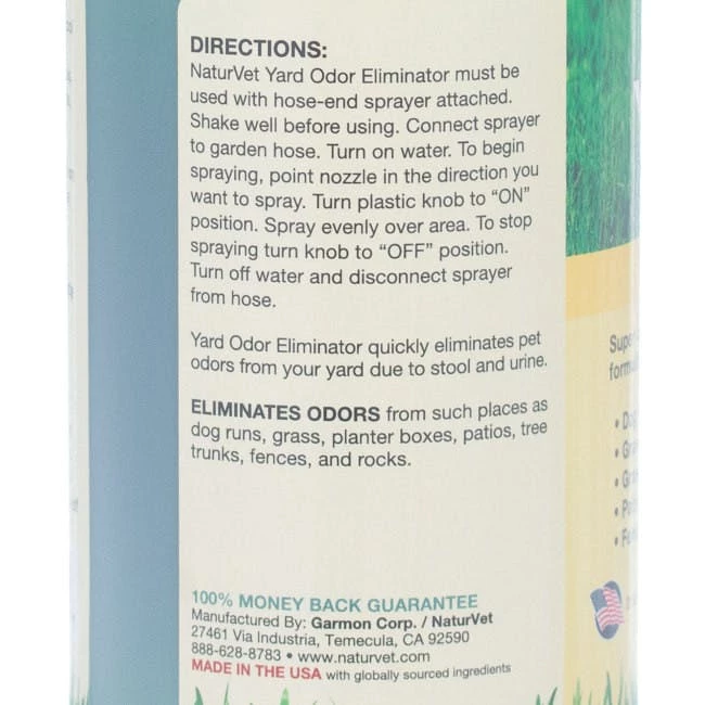 NaturVet® Yard Odor Eliminator safely and effectively eliminates the stool and urine odors that permeate your outdoor surfaces. This formula is safe to use on grass, plants, shrubs, patios, kennels, dog runs, swing sets, fences, and other outdoor surfaces where odors can arise. To use this product, simply attach it to a garden hose and spray the affected surface for fast and effective odor control. NaturVet® Yard Odor Eliminator in a 32 oz bottle provides a ready-to-use formula with a spray-action adapter nozzle.