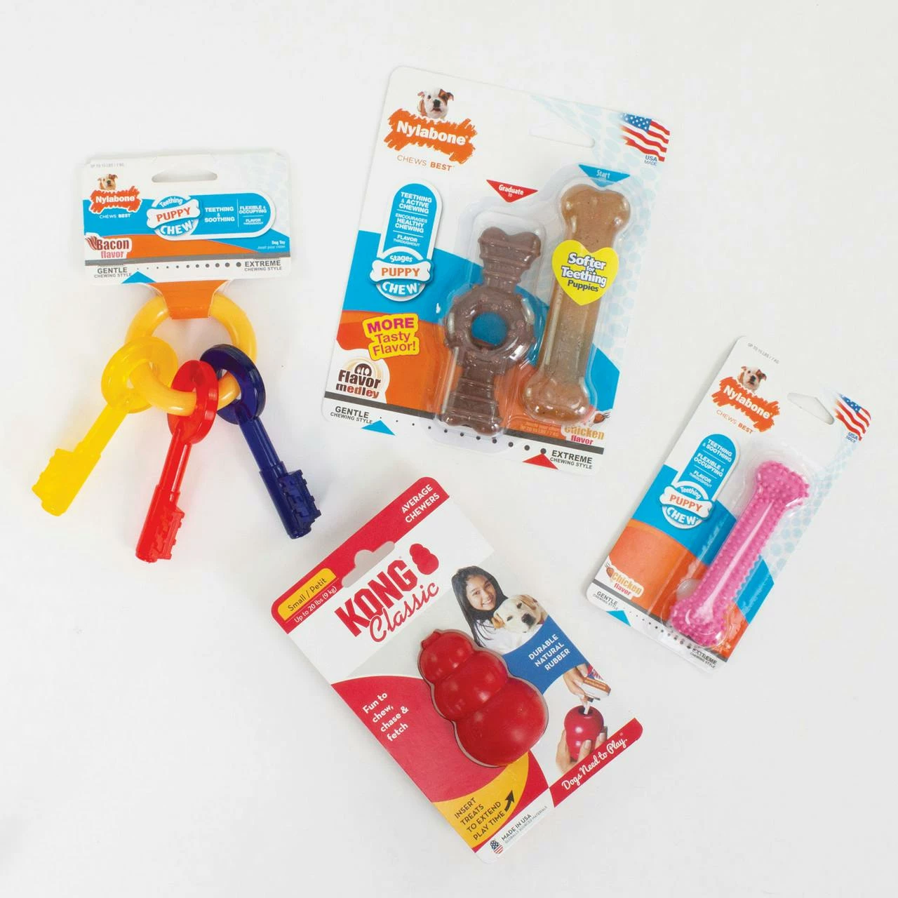 Nylabone® Puppy Keys-X-Small promotes healthy puppy chewing habits and oral hygiene. The keys are made from bacon-flavored, soft puppy-safe material.