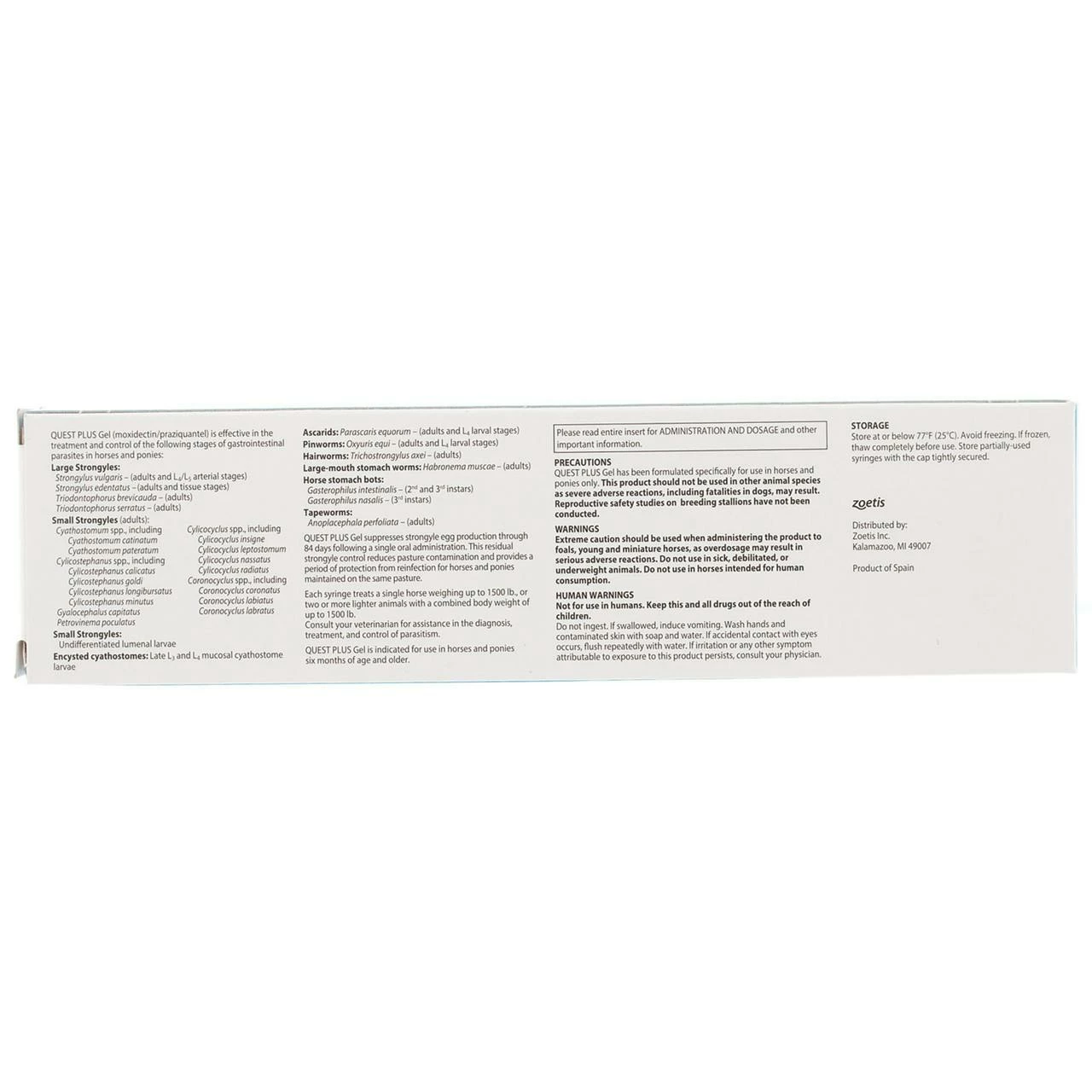 QUEST Plus Equine Oral gel is an FDA-approved broad-spectrum equine dewormer. This horse dewormer contains both praziquantel and moxidectin for horses and helps suppress production of small strongyle eggs for 84 days. QUEST Plus is approved for the removal and control of large strongyles Strongylus vulgarisS. edentatus, Triodontophorus brevicauda, T. serratus, small strongyles Cyathostomum spp., Cylicocyclus spp., Cylicostephanus spp. Gyalocophalus capitatus encysted cyathostomes; Ascarids Parascaris equorum, pinworms Oxyuris equi, hairworms Trichostrongylus axei, largemouth stomach worms Habronema muscae, stomach bots Gasterophilus intestinals, G. nasailis tapeworms Anaplocephala perfoliate. Quest Plus wormer is safe to use in breeding mares and stallions.
