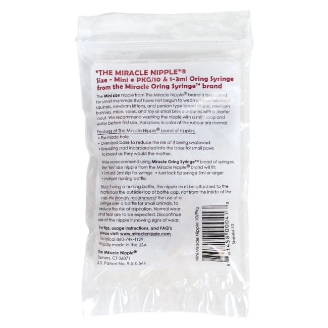 Developed with small animals in mind, the Miracle Nipple® for kittens, puppies, and other small mammals is designed with a kneading pad to allow animals to knead with their paws while nursing as they would do naturally. Made of a flexible natural rubber material that far outlasts other nipples, the Miracle Nipple® for puppies and other animals provides less chance of small, sharp teeth piercing the nipple. This nipple for puppies and kittens is specifically made to alleviate the chance of an animal swallowing the entire nipple or biting the nipple in half. This puppy and kitten nipple is available in four sizes: the Miracle Nipple® Mini for pets and wildlife that are small or newborn; the Original for most kittens and toy breed puppies; the Small Puppy for smaller breed puppies (not toy size) and medium breed puppies and Large for medium to large breed puppies. The Miracle Nipple® is washable, reusable, and made in the USA.