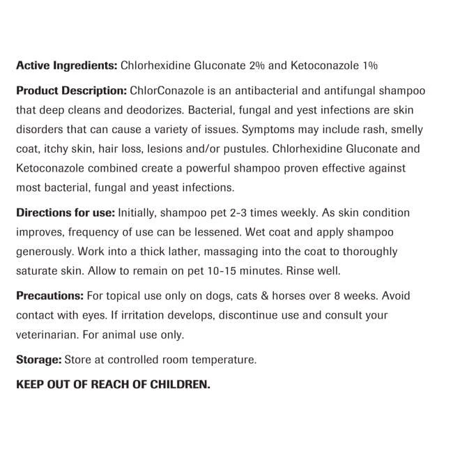 ChlorConazole Shampoo is a pleasantly fragranced medicated shampoo with antibacterial and antifungal properties. Chlorhexidine gluconate and ketoconazole help manage your pet’s dermatological conditions such as bacterial skin conditions and fungal infections. It also offers a premium deodorizing and deep cleansing lather action.